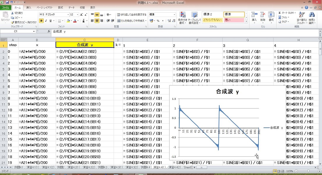 3) E2のセルに漸化式 "sin( k・x ) / k" を入力する.また,コピーしたときの参照位置に注意して,複合参照を使う.