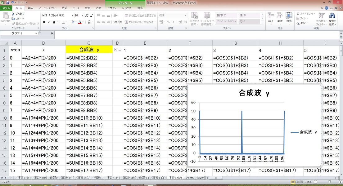 2) 三角関数のデータ入力の要領で,A,B列に0~4πのxのデータを作る(ここでは,0~4πを200分割している).
